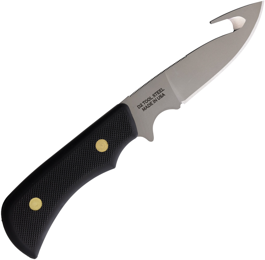 8.5″ (21.59cm) overall. 3.25″ (8.26cm) bead blast finish D2 tool steel guthook blade. Black SureGrip handle. Full tang. Brown leather belt sheath. Boxed.