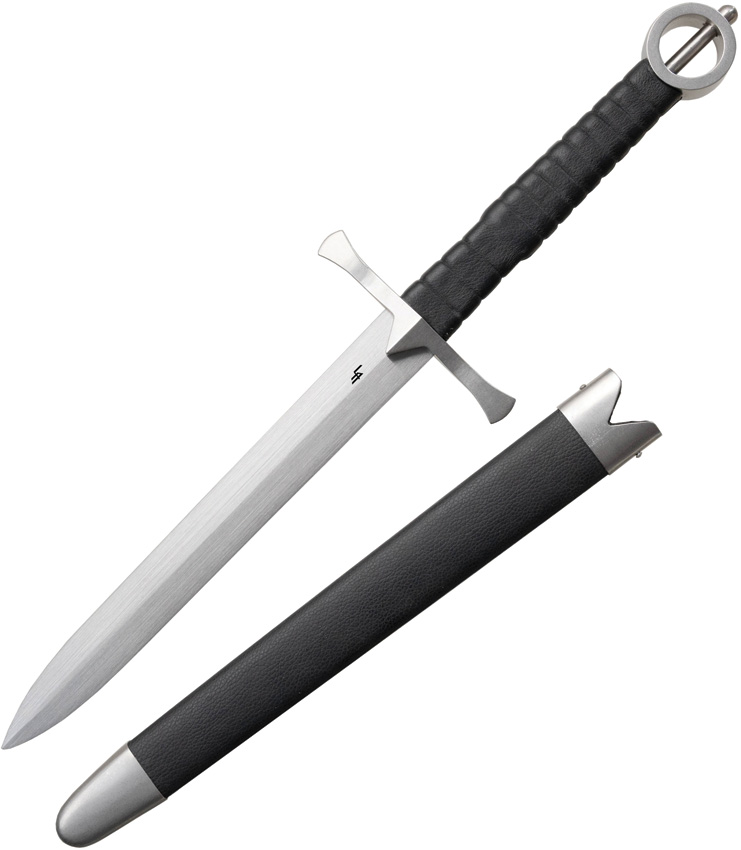 19″ (48.26cm) overall. 11.25″ (28.58cm) satin finish 5160 carbon steel blade. Black leather wrapped handle. Full tang. Polished steel cross guard and pommel. Black wood scabbard. Boxed.