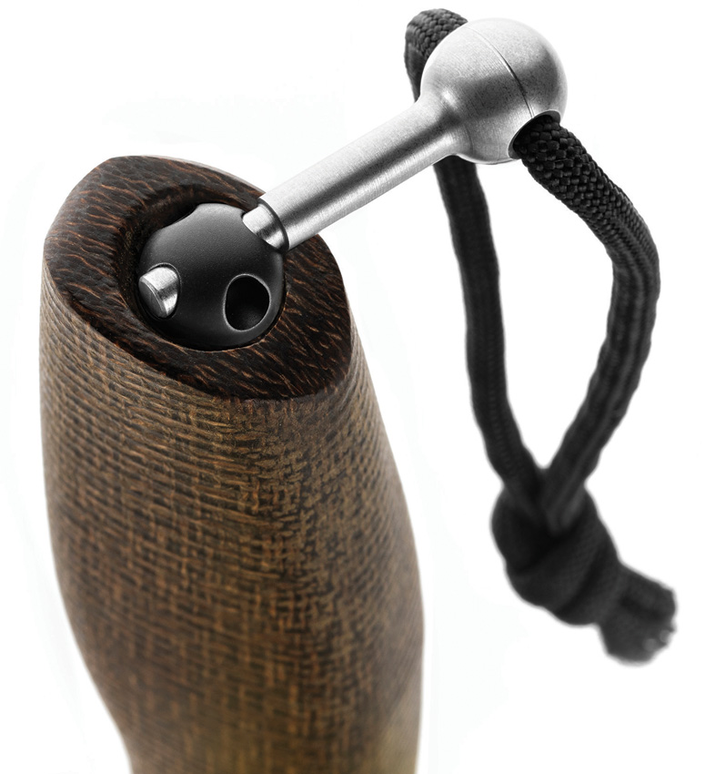 9.2″ (23.37cm) overall. 4.25″ (10.8cm) black PVD coated Bohler M390 stainless blade. Green burlap micarta handle. Titanium guard. Blade tang goes “ACross the HAndle” and it is fixed at the end with an original steel nut. There is a steel key in the box that has to go through the nut holes and can be used as a lever to unscrew the cap. ACHA was designed by Molletta and it is the first knife in the LionSteel family built in this special way. Black leather belt sheath. Boxed.