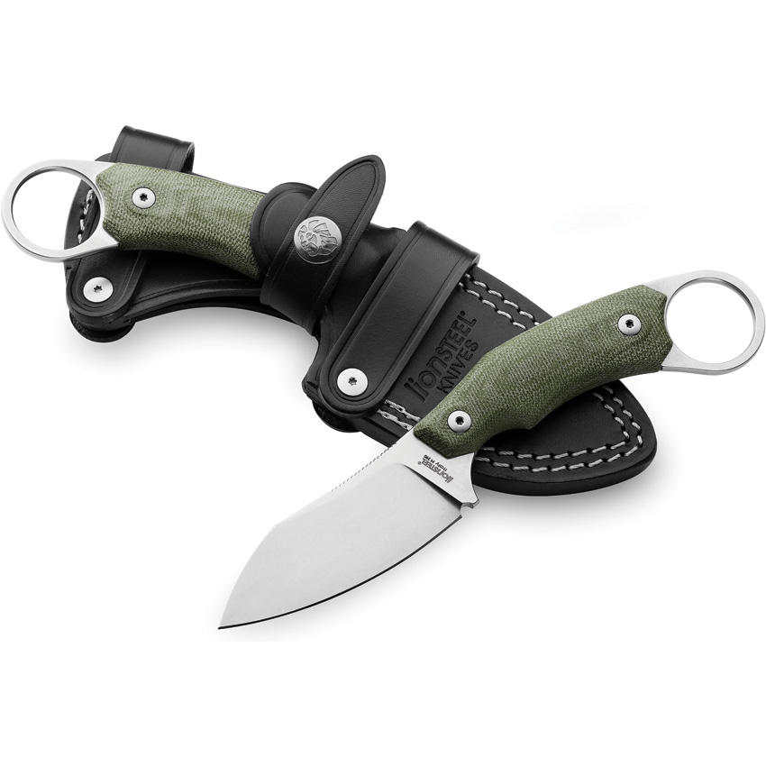7.25″ (18.42cm) overall. 3″ (7.62cm) stonewash finish Bohler M390 stainless skinner blade. Green canvas micarta handle. Full, extended tang. Finger ring. Black leather belt sheath. Boxed.