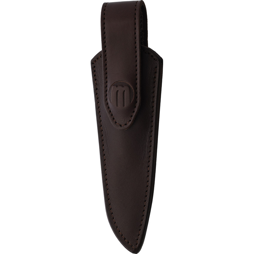 6″ (15.24cm) overall. 2.75″ (6.99cm) satin finish 14C28N Sandvik stainless blade. Full tang. Brown dyed poplar wood handle. Brown leather belt sheath. Boxed.