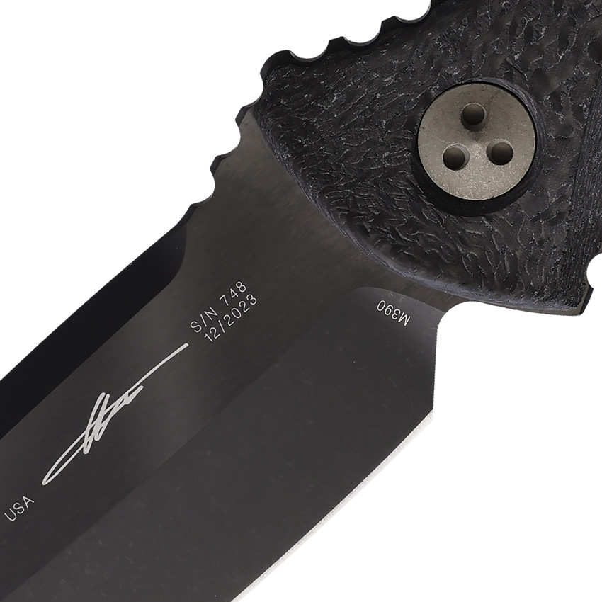 8.17″ (20.75cm) overall. 3.75″ (9.53cm) black DLC coated premium steel tanto blade. Carbon fiber handle. Full, extended tang. Lanyard hole. Black Kydex belt sheath. Boxed.