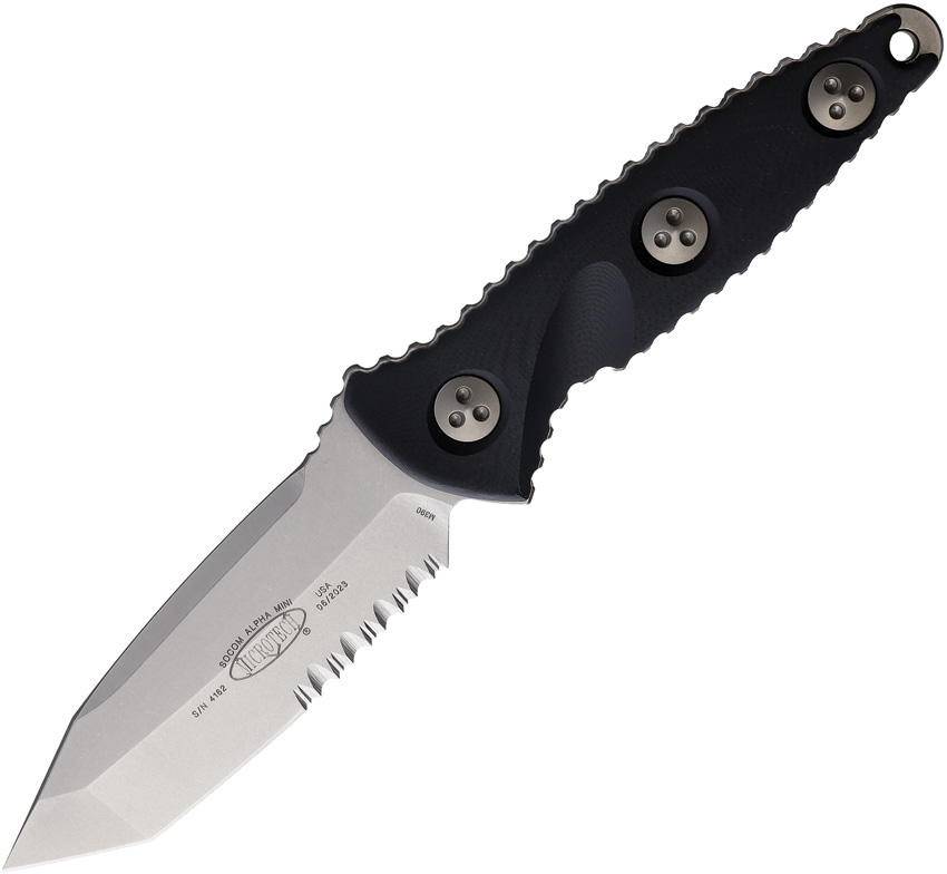 8.17″ (20.75cm) overall. 3.75″ (9.53cm) stonewash finish partially serrated Bohler M390 stainless tanto blade. Black G10 handle. Full, extended tang. Lanyard hole. Black Kydex belt sheath. Boxed.