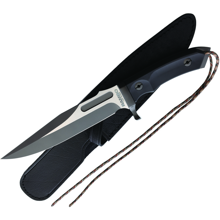 14″ (35.56cm) overall. 8″ (20.32cm) stainless bowie blade. Black sculpted synthetic handle. Hand ground and polished finish blade. Black buffalo hide leather belt sheath. Camo paracord lanyard. Licensed replica that was created based on an actual knife used in connection with the production. Boxed.