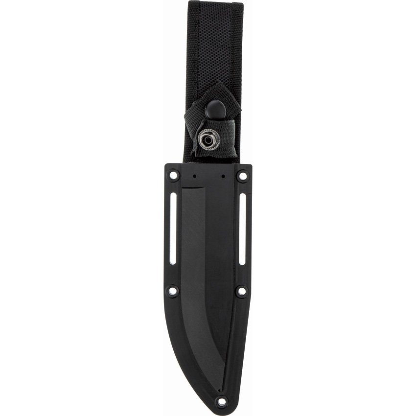10″ (25.4cm) overall. 5″ (12.7cm) black finish sawback 8Cr13MoV stainless clip point blade. Black rubberized polymer handle. Stainless guard and pommel. Full tang. Hammer pommel. Black synthetic belt sheath. Boxed.
