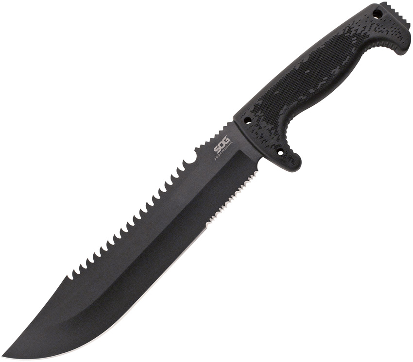 Overall: 15.25″; Blade: 9.5″ l 8Cr13MoV Stainless l Partially Serrated Edge; Handle: Black l Kraton; Other Info: Lanyard Hole. Black hardcase finish sawback bowie blade. Digi-Grip handles. Black ballistic nylon belt sheath. Hang Packaged.