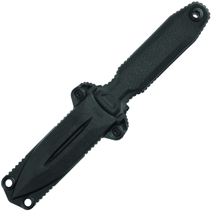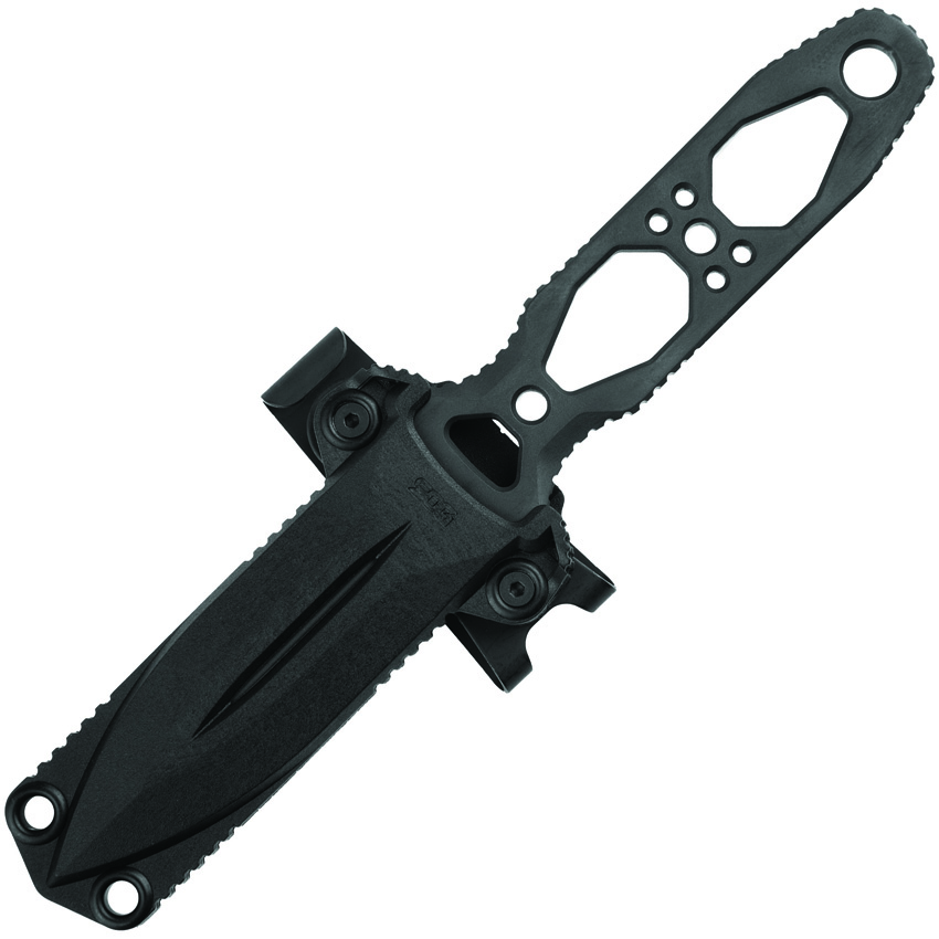 7.5″ (19.05cm) overall. 3.5″ (8.89cm) black TiNi coated S35VN stainless blade. Black G10 handle. Full tang. Fully ambidextrous carry. Handles are removable. Universal mounting system. Black GRN MOLLE compatible belt sheath. Boxed.