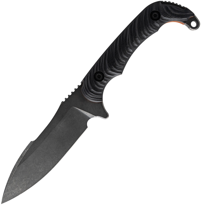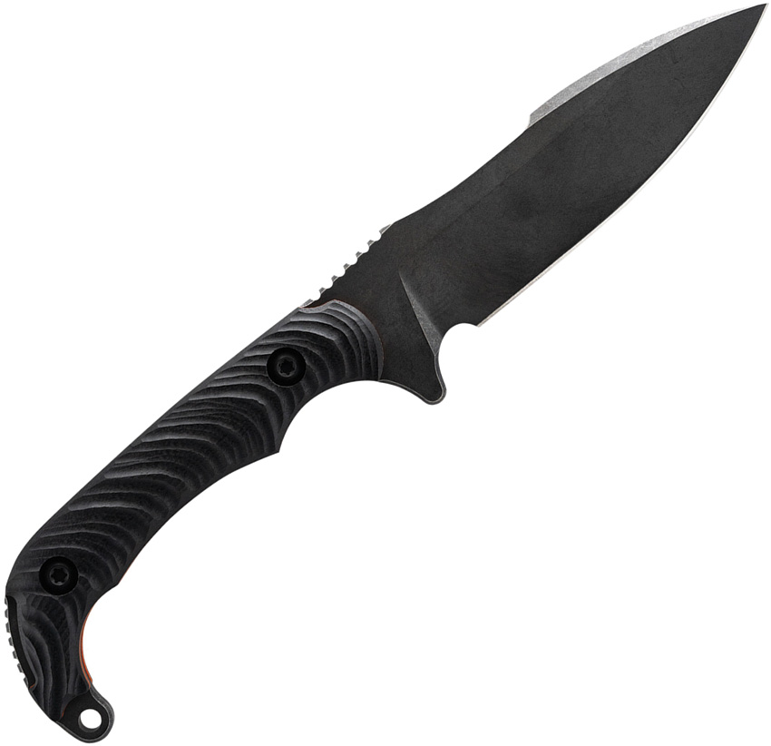 8.38″ (21.29cm) overall. 4.25″ (10.8cm) black oxide coated CPM Cru-Wear steel blade. Black sculpted G10 handle. Full, extended tang. Lanyard hole. Orange liners. This Item may only be EXPORTED. It may NOT be sold to customers within the United States. Black Kydex belt sheath. Boxed.