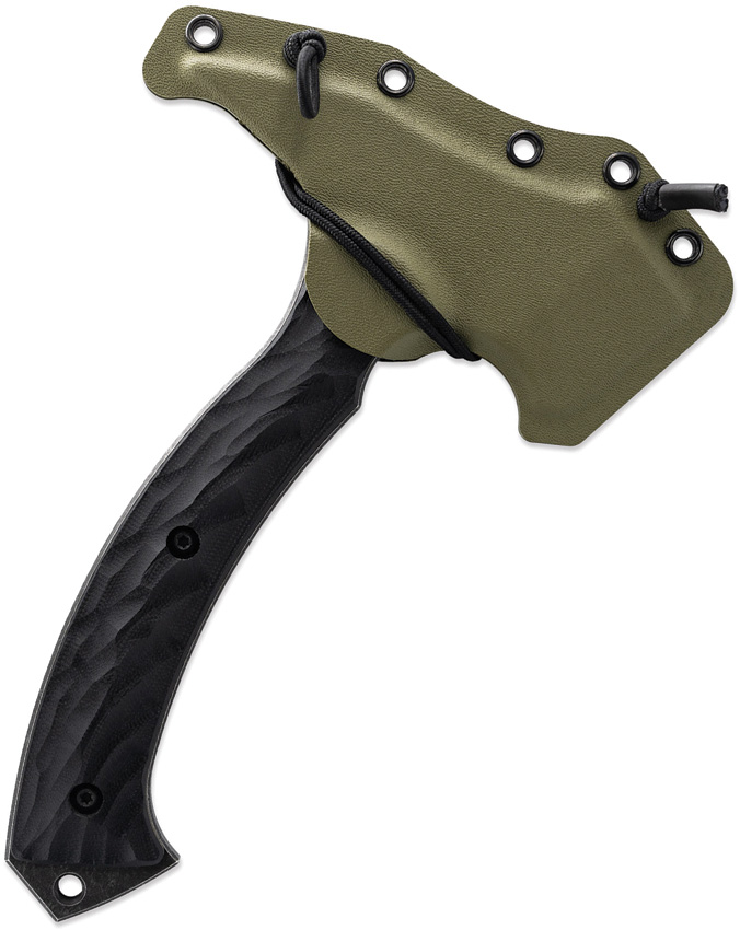 9″ overall. 5.5″ black oxide coated D2 tool steel axe head with 3″ cutting edge. Black sculpted G10 handle. Full, extended tang. Lanyard hole. Weight: 1.1lb. Spike end. 90 degree point at the head of the axe. FlexTech Kydex belt sheath. Serialized. This Item may only be EXPORTED. It may NOT be sold to customers within the United States. Boxed.