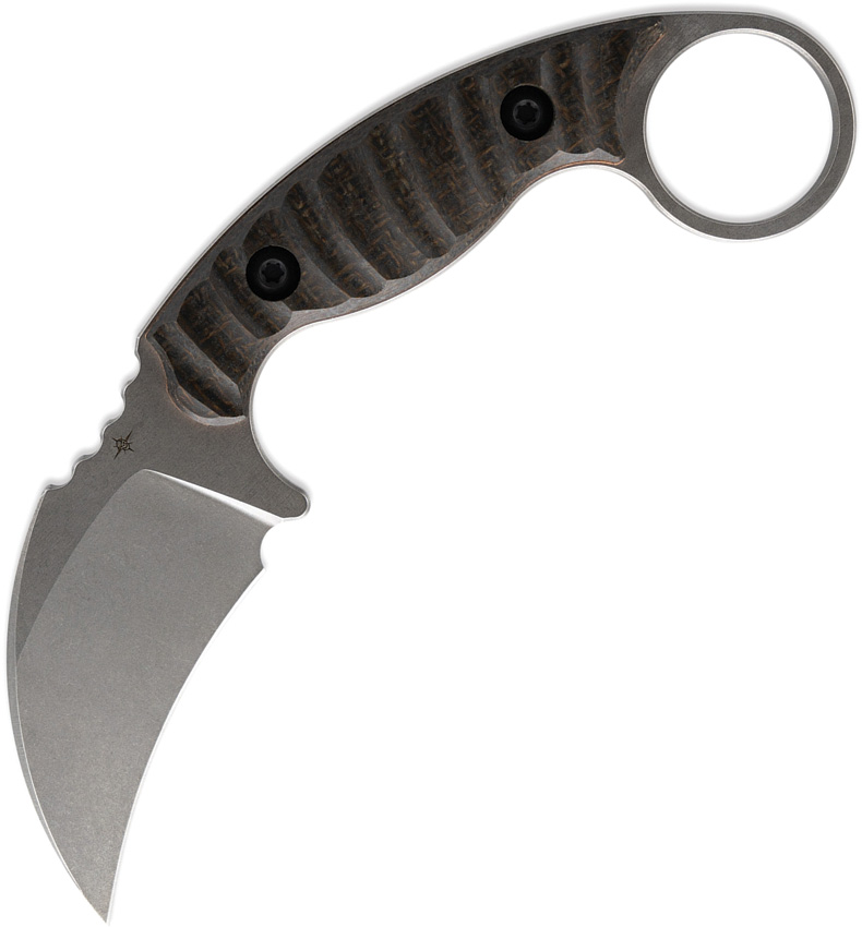 6.63″ (16.84cm) overall. 2.5″ (6.35cm) stonewash finish CPM-154 stainless curved blade. Brown burlap sculpted micarta handle. Full, extended tang. Finger ring. WHL exclusive. This Item may only be EXPORTED. It may NOT be sold to customers within the United States. Black Kydex belt sheath. Boxed.