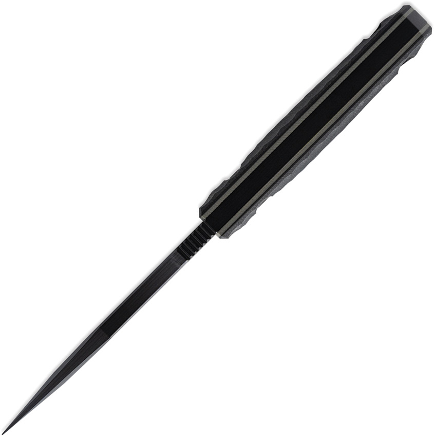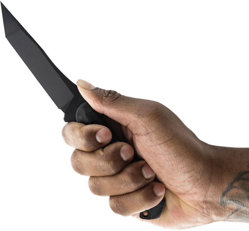 8″ (20.32cm) overall. 4″ (10.16cm) black Gun-Kote finish CPM-M4 stainless blade. Black sculpted G10 handle. Full, extended tang. Lanyard hole. Black Tru-Hide Kydex belt sheath. This Item may only be EXPORTED. It may NOT be sold to customers within the United States. Boxed.