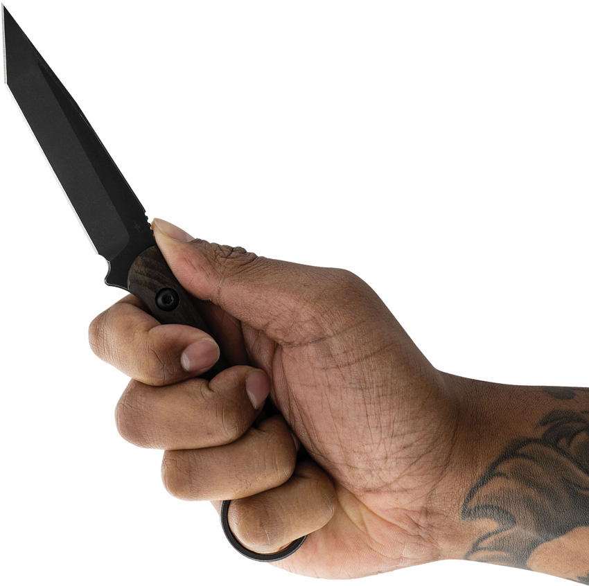 8.25″ (20.96cm) overall. 3.75″ (9.53cm) black oxide coated CPM-3V carbon steel tanto blade. Black sculpted G10 handle. Full, extended tang. Finger ring. Slimline FlexTech belt sheath. This Item may only be EXPORTED. It may NOT be sold to customers within the United States. Boxed.