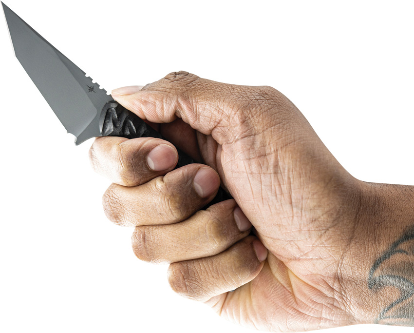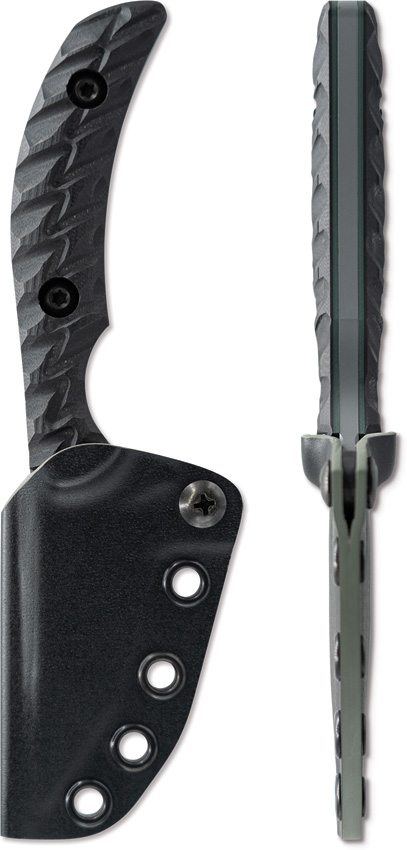 6.38″ (16.21cm) overall. 2.75″ (6.99cm) Gun-Kote finish CPM-M4 stainless tanto blade. Black sculpted G10 handle. Full tang. Phantom gray blade. Green liners. Black Kydex belt sheath. Boxed.