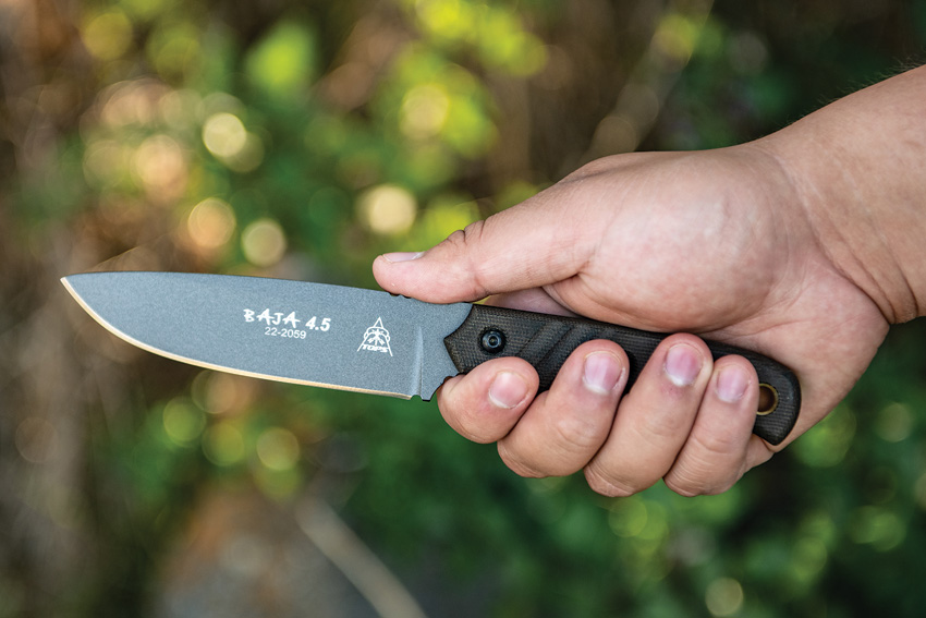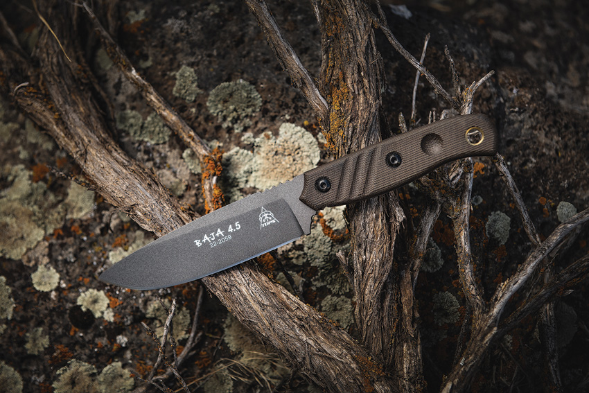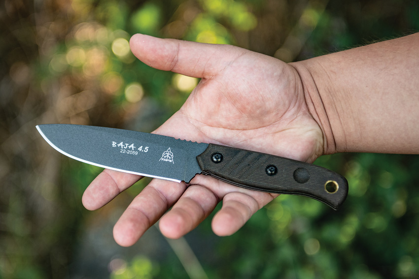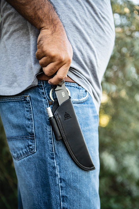 9 1/4″ overall. 4 7/8″ 1095 high carbon steel blade with black river wash finish. Full tang. Green canvas micarta handles. Oversized lanyard hole. Black leather belt sheath. Comes with TOPS emergency whistle and 3 1/8″ overall fire starter with 2″ rods. Bulk packed.