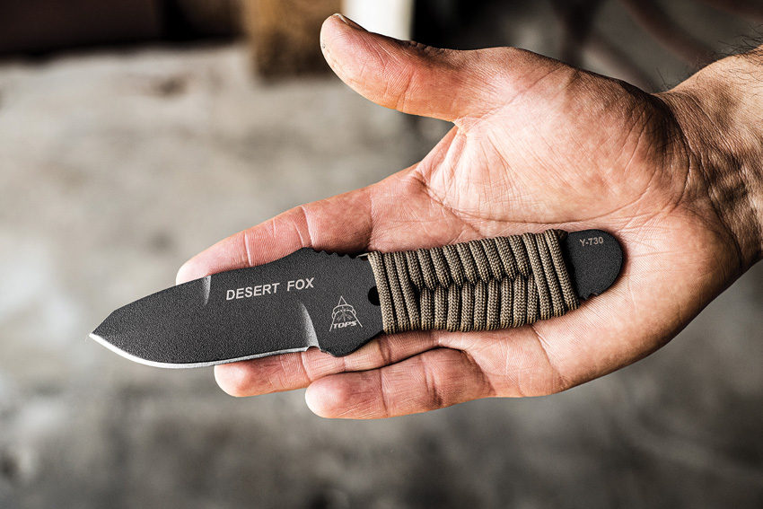 6 3/4″ overall. 3″ blade. One piece 1095 high carbon steel construction with tactical gray finish. Desert tan paracord wrapped handle. Molded black Kydex sheath with belt clip. Packaged with TOPS emergency whistle.