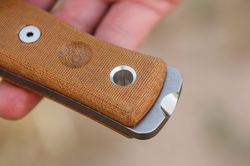 10″ (25.4cm) overall. 4.75″ (12.07cm) tumbled finish 1095HC steel modified Scandi grind blade. Tan linen micarta handle. Lanyard hole. Full, extended tang. Handle features a divot that can be used as the socket for the fire bow drill method. Pommel features a scraper specially designed for striking Ferro rods in a safe and efficient manner. Black Kydex belt clip sheath with a built-in Ferro-rod attachment point. Bulk packed.