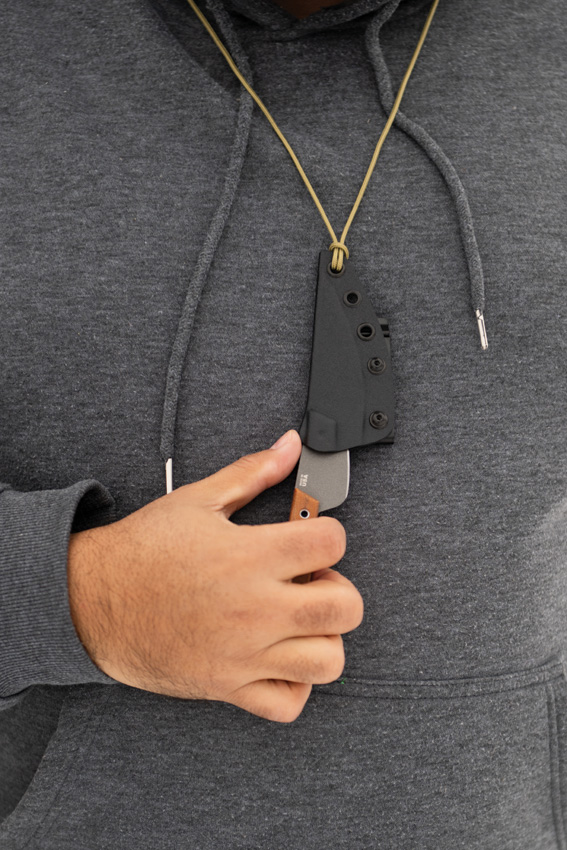 6″ (15.24cm) overall. 3.25″ (8.26cm) gray Tungsten Cerakote 1095HC steel blade. Tan canvas micarta handle. Full tang. Black Kydex neck sheath. Bagged.