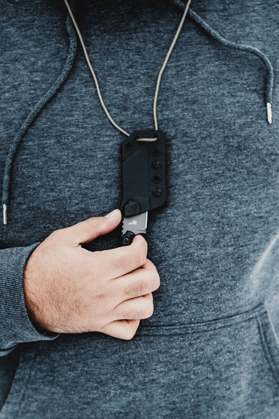 5″ (12.7cm) overall. 2″ (5.08cm) gray Tungsten Cerakote 1095HC steel Wharncliffe blade. Black canvas micarta handle. Full tang. Black Kydex neck sheath. Bagged.