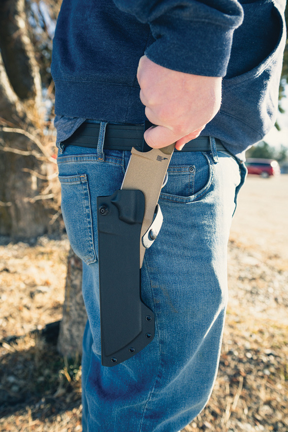 13.88″ (35.26cm) overall. 8.38″ (21.29cm) coyote tan coated 1095HC steel blade. Green canvas micarta handle. Full, extended tang. Lanyard hole. Dangler attachment. Black Kydex belt sheath. Designed by Leo Espinoza. Bagged.
