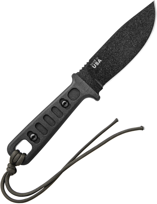 8 1/2″ overall. 4 1/4″ 1095 high carbon steel blade with black traction coating. Full tang. Black canvas micarta handles with black composition inlays. Black lanyard. Molded black Kydex sheath with multi-position boot/belt clip. Comes with firestarter and survival whistle.