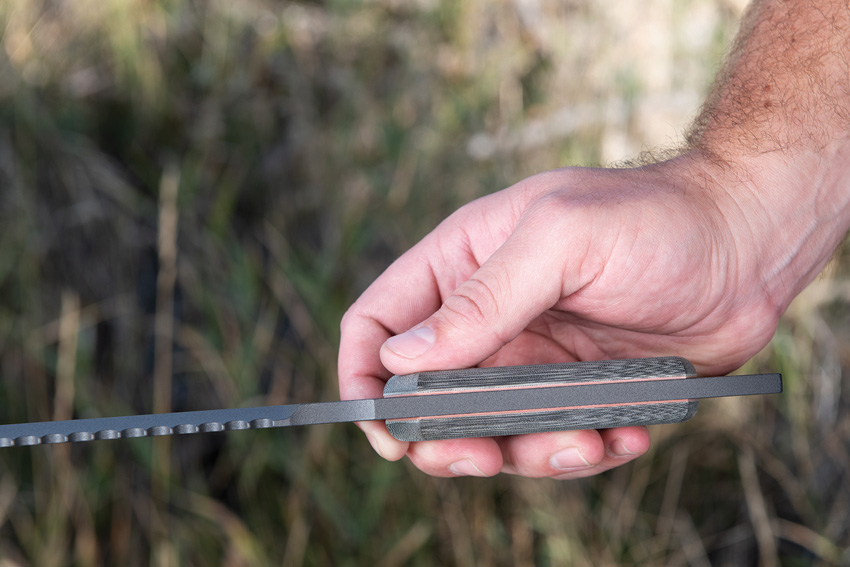 13 1/2″ overall. 8 1/2″ 1095 high carbon steel sawback blade with gray epoxy powder coating. Full tang. Gray micarta handles. Heavy black nylon belt sheath with hardshell liner.