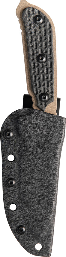 8″ (20.32cm) overall. 4″ (10.16cm) coyote tan coated 1095HC steel Hunter’s point blade. Black linen micarta handle. Full tang. Black Kydex belt sheath. Bulk packed.