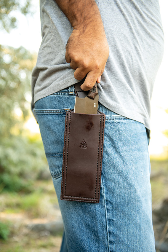 11.63″ (29.54cm) overall. 6.5″ (16.51cm) 1095HC steel blade. Full tang. Lanyard hole. Midnight bronze finish blade. Black canvas and brown burlap micarta handle. Tan Kydex belt sheath. Bulk packed.