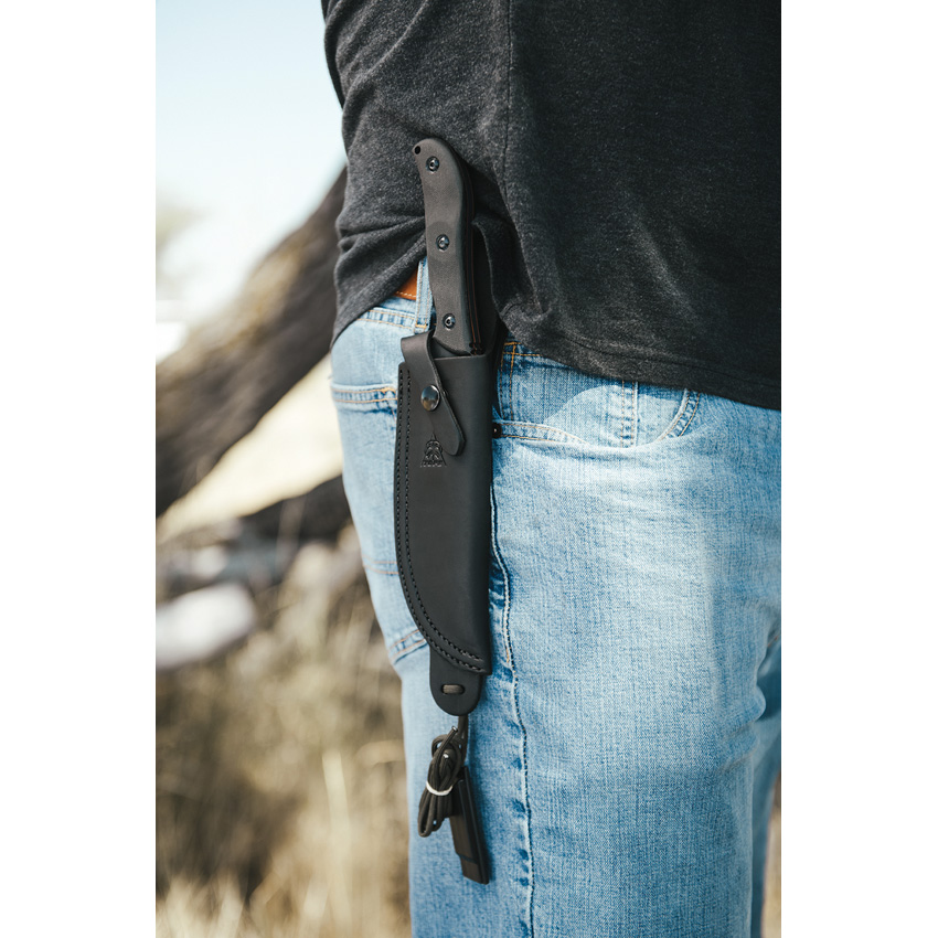 11.25″ (28.58cm) overall. 6.38″ (16.21cm) 1095HC steel Hunter’s point blade. Black canvas micarta handle. Full tang. Lanyard hole. Sniper gray finish blade. Black leather belt sheath. Bulk packed.