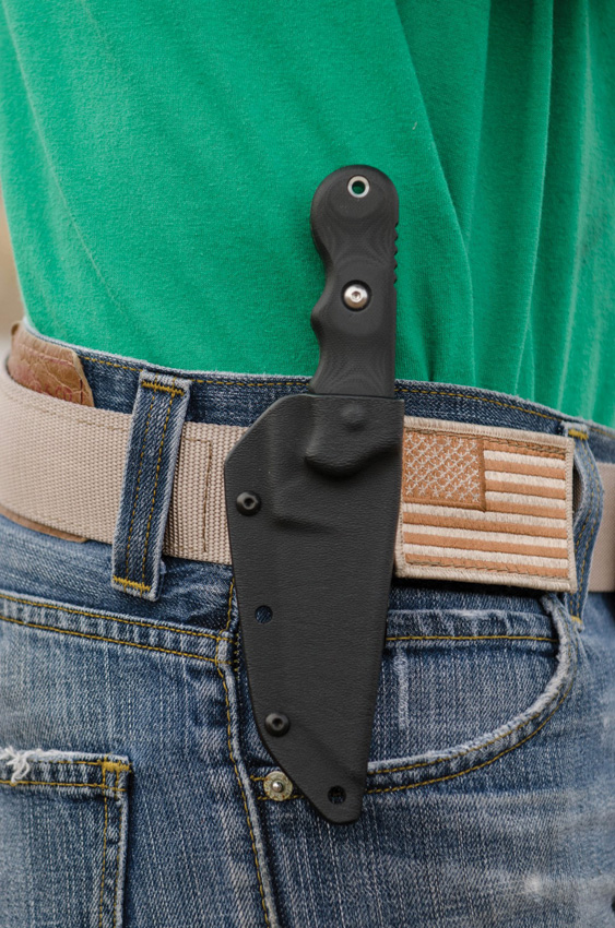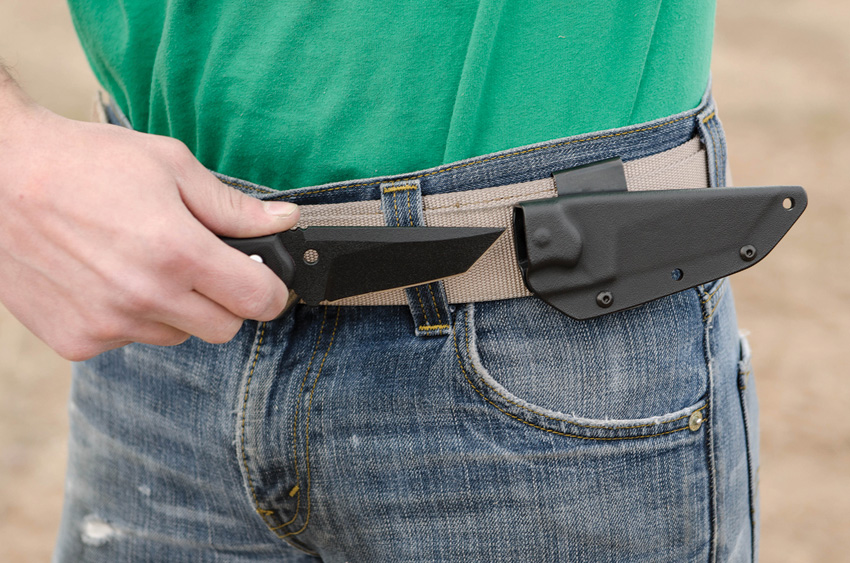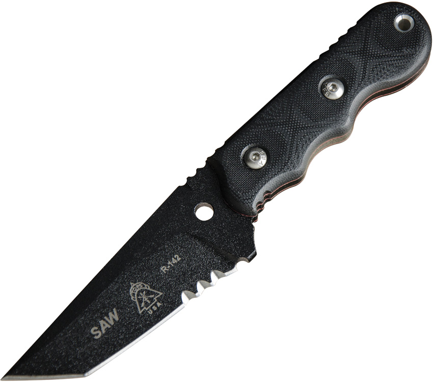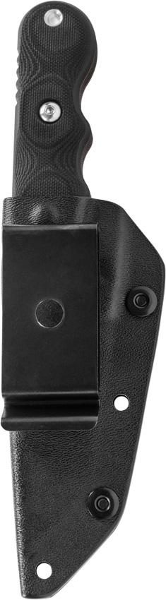 7 1/2″ overall. 3 1/4″ partially serrated black traction coated 1095 high carbon steel tanto blade. Black G-10 handles. Black Kydex belt clip sheath. Lanyard hole.