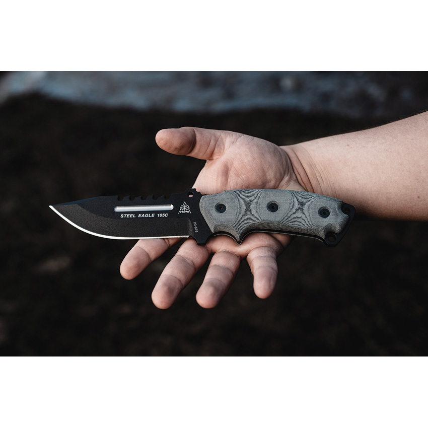9.75″ (24.77cm) overall. 5″ (12.7cm) black traction coated sawback 1095HC steel Hunter’s point blade. Black linen micarta handle. Full tang. Lanyard hole. Black Kydex belt sheath. Bulk packed.