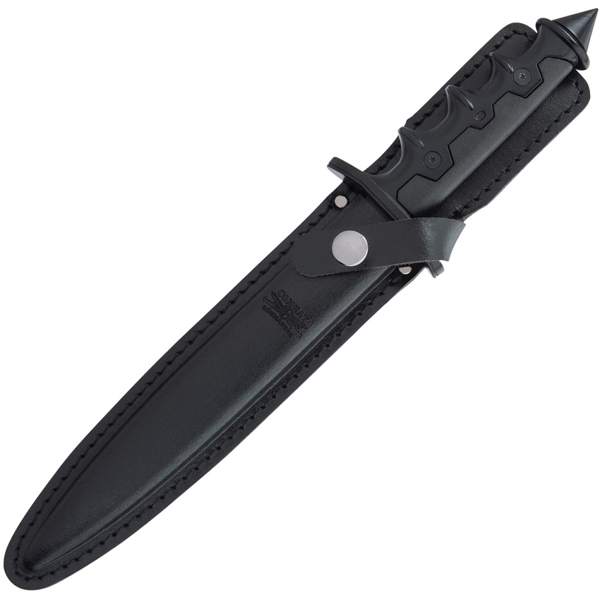 13.38″ (33.99cm) overall. 8.13″ (20.65cm) black coated double edge 1065 carbon steel blade. Black powder coated aluminum handle with black TPR insert. Finger grooved handle with skull crusher pommel. Black leather belt sheath. Boxed.
