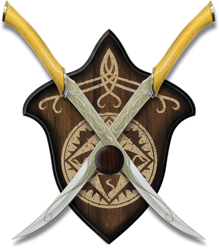 22.38″ (56.85cm) overall. 15″ (38.1cm) stainless blade. Wood handle. Metal alloy guard and pommel. Elven vine decorative accents. Comes with display plaque. Certificate of Authenticity. A licensed reproduction of the knives featured in The Lord of the Rings films. Boxed.