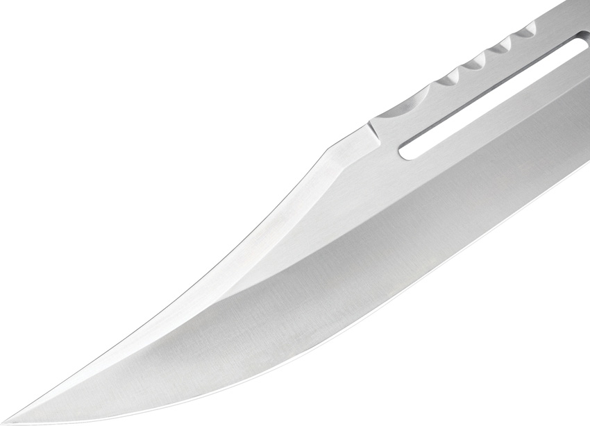 18″ (45.72cm) overall. 11.88″ (30.18cm) blade. Dark brown wood handle. Stainless guard and pommel. 7Cr13 stainless blade with a 2-direction satin finish and mirror-polished top grind. Micarta spacers on handle. Exact reproduction of the fully functional knife, created by custom knifemaker Gil Hibben, that was a hero prop in a 1988 blockbuster movie. It was replicated using the original prop from the movie star’s personal knife collection. Leather belt sheath. Boxed.