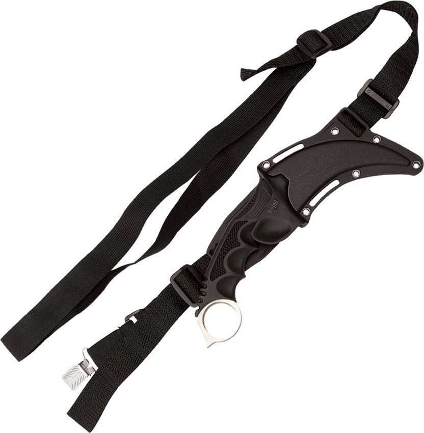 8 3/4″ overall. 4″ 7Cr13 stainless curved blade. Finger grooved black rubber over-mold handle. Integrated finger ring. Molded black ABS sheath with shoulder harness.