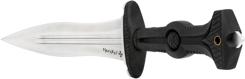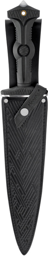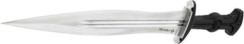 18.63″ (47.32cm) overall. 11.88″ (30.18cm) satin finish 1060HC steel blade. Black TPR handle. Stainless guard and pommel. Double fuller blade with penetrating point. Black leather belt sheath. Boxed.