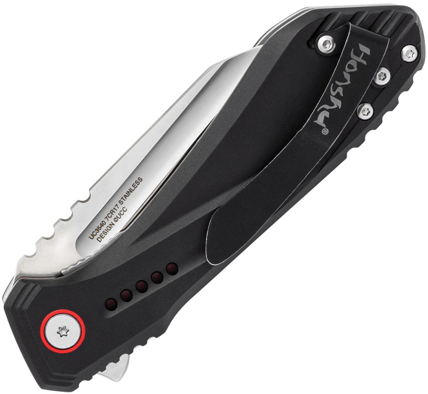 4.5″ (11.43cm) closed. 3.5″ (8.89cm) satin finish stainless Wharncliffe blade. Black aluminum handle. Extended tang. Pocket clip. Boxed.