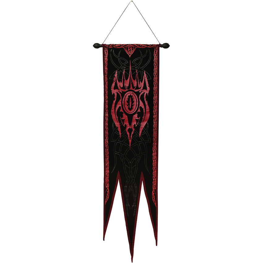 46.5″ (118.11cm) overall. Red eye edition. 15.5″ mace head. A replica of the massive mace wielded by the Dark Lord Sauron in the prologue of The Lord of the Rings: The Fellowship of the Ring. Crafted of reinforced fiberglass-resin with an aged iron finish. Close attention to detail is a top priority in every piece, down to the intaglio-etched surface and corroded metal coloring. The oversized One Ring worn by Sauron is also included, crafted in gold plated solid metal. 54″ banner for wall decoration. Displays on a polystone wall mount (mounting hardware and instructions included). Boxed.