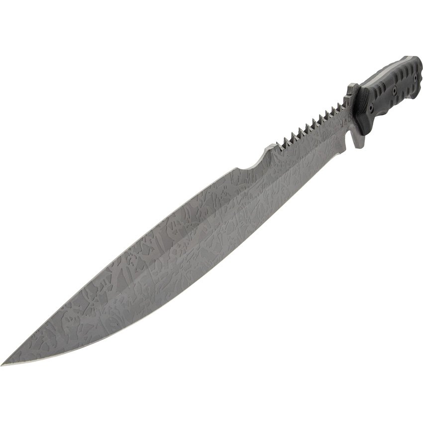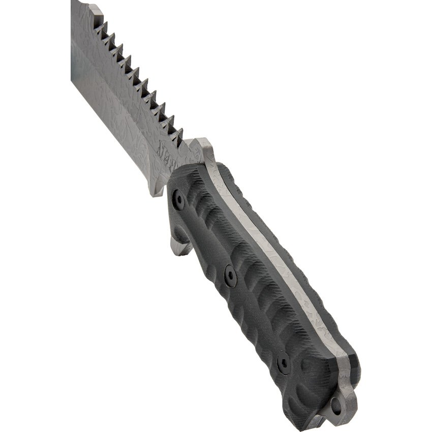 17.75″ (45.09cm) overall. 11.5″ (29.21cm) sawback 3Cr13 stainless blade. Black TPU handle. Full, extended tang. Lanyard hole. Titanium electroplated blade. Black nylon MOLLE compatible belt sheath. Boxed.