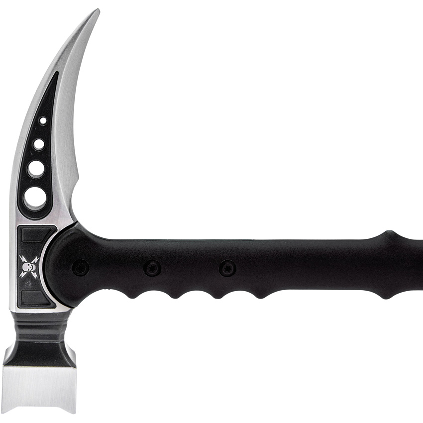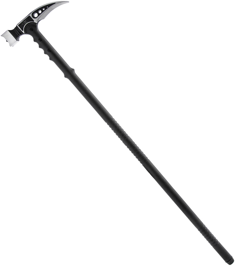 37.38″ overall. Black oxide and satin coated stainless head with curved back spike and stout hammer head. Black fiberglass handle. Rubber foot on shaft allows for use as a staff. Boxed.