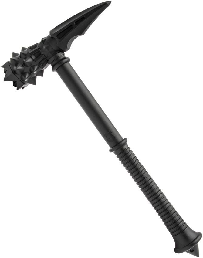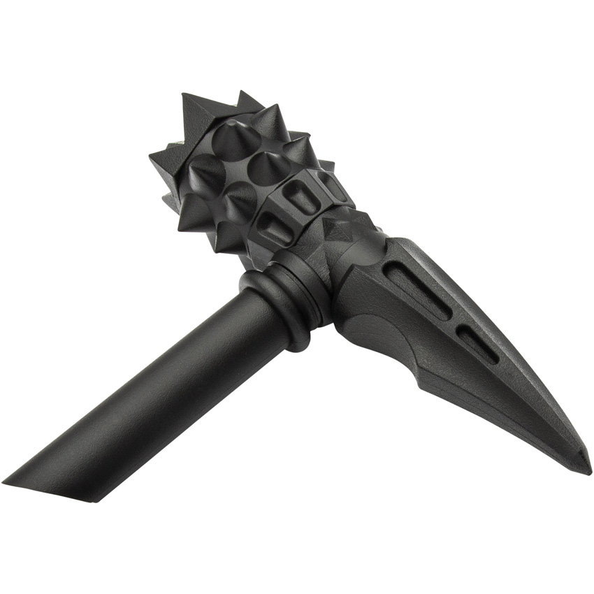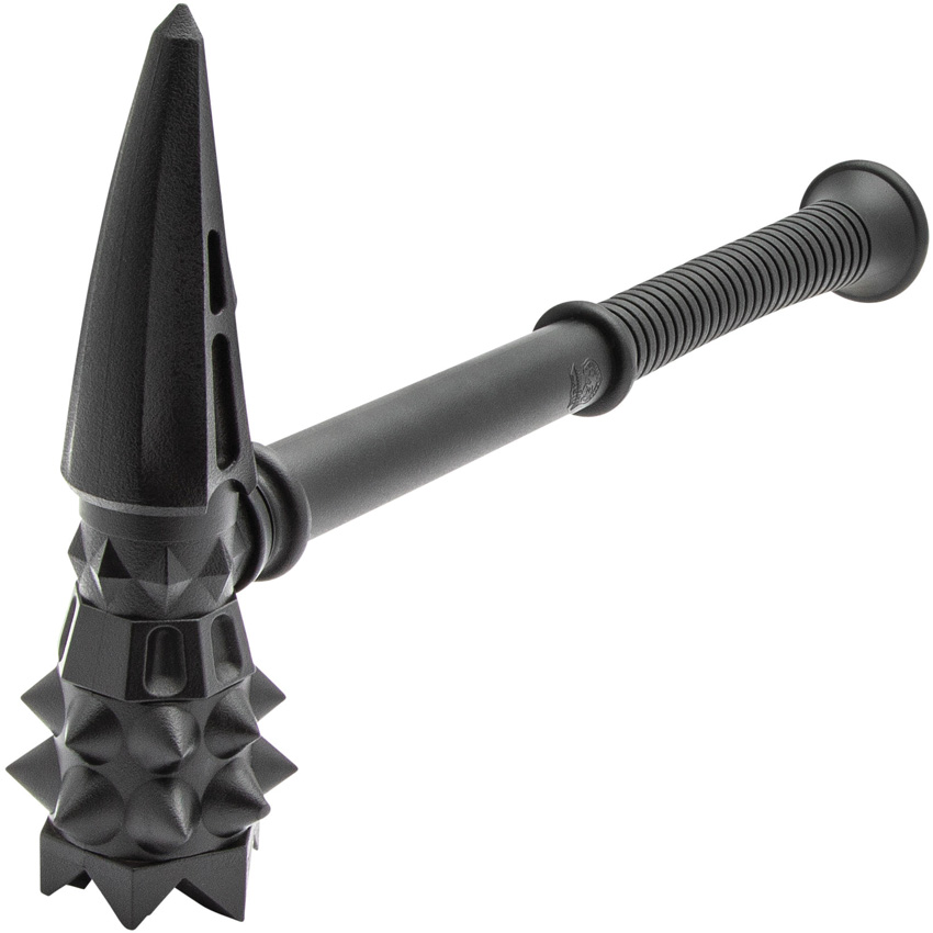 22″ (55.88cm) overall. Lanyard hole. 10.25″ hammer head crowned and circled with spikes and penetrating tomahawk-style back. Deeply grooved handle and skull crusher pommel. One-piece injection molded polypropylene construction.
