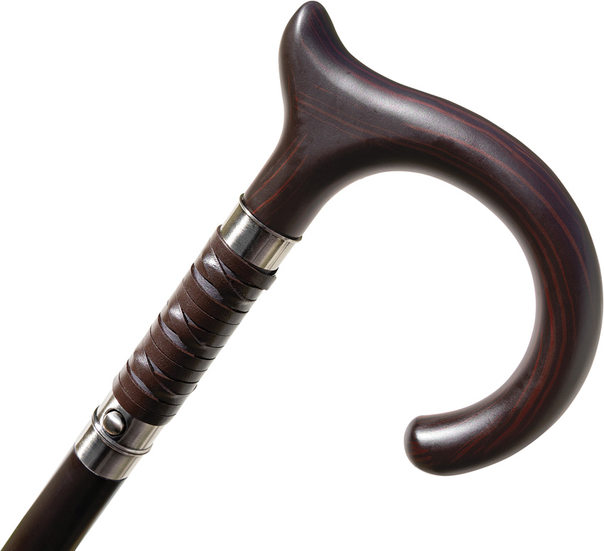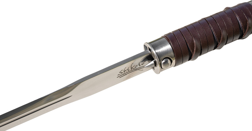 37.38″ (94.95cm) overall. 23″ (58.42cm) carbon steel blade. Genuine leather-wrap accents both the cane shaft and the lower portion of the handle. The blade release is stainless steel, matching a stainless steel accent band below the handle’s faux wood grip. Rubber foot. Boxed.