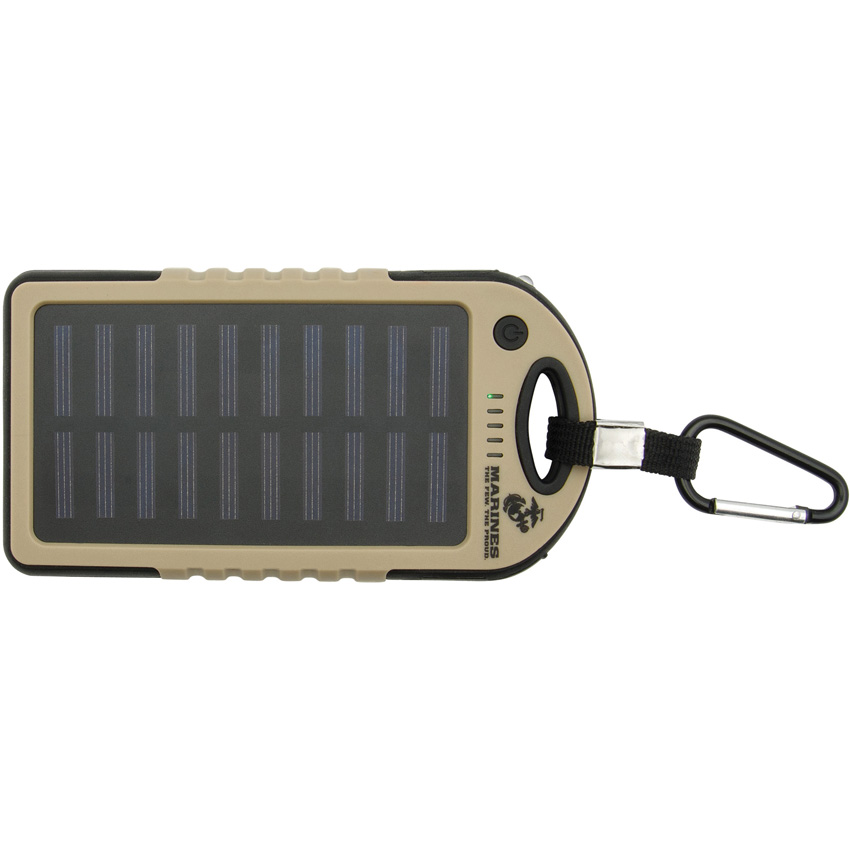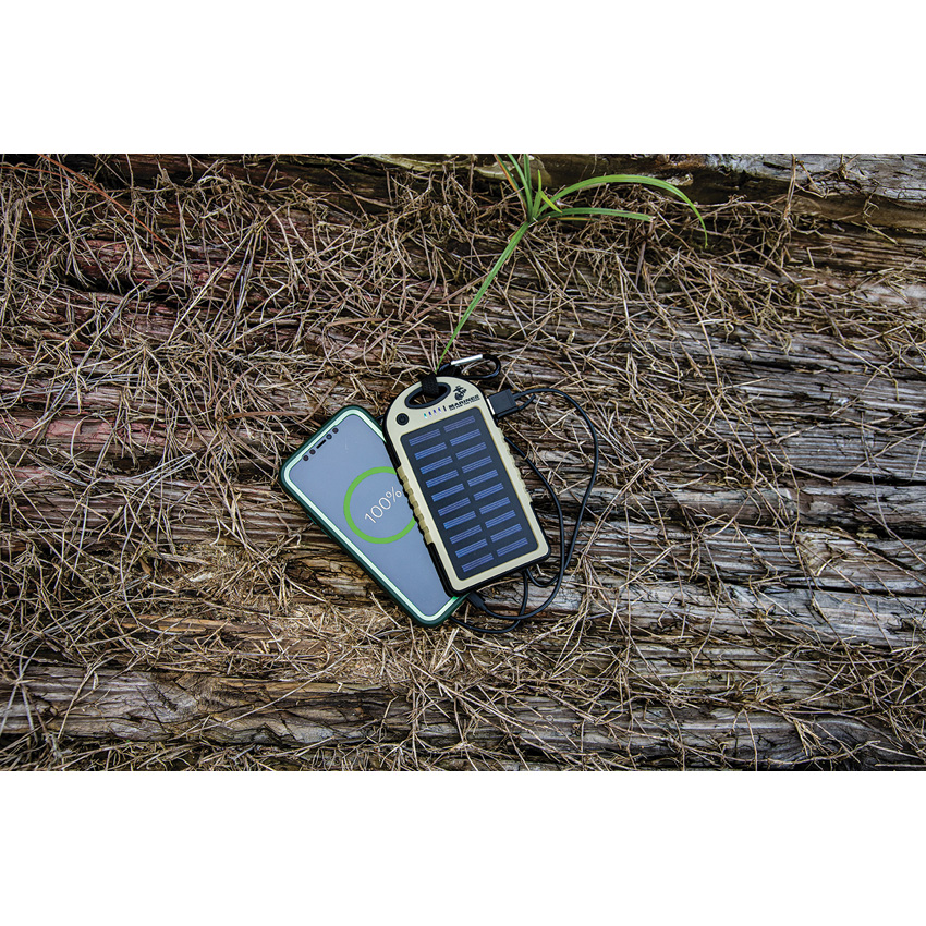8000 MAH. 1.2 watt monocrystalline solar panel. LED capacity indicators. Water resistant, shock and dust proof. Silica gel and ABS/PC construction with rubber paint surface process. Hidden dual USB/micro charging ports. Emergency LED light. Carabiner. Can be used to charge phones, tablets, GPS devices, cameras, and more. Requires (1) Lithium battery (included). Boxed.