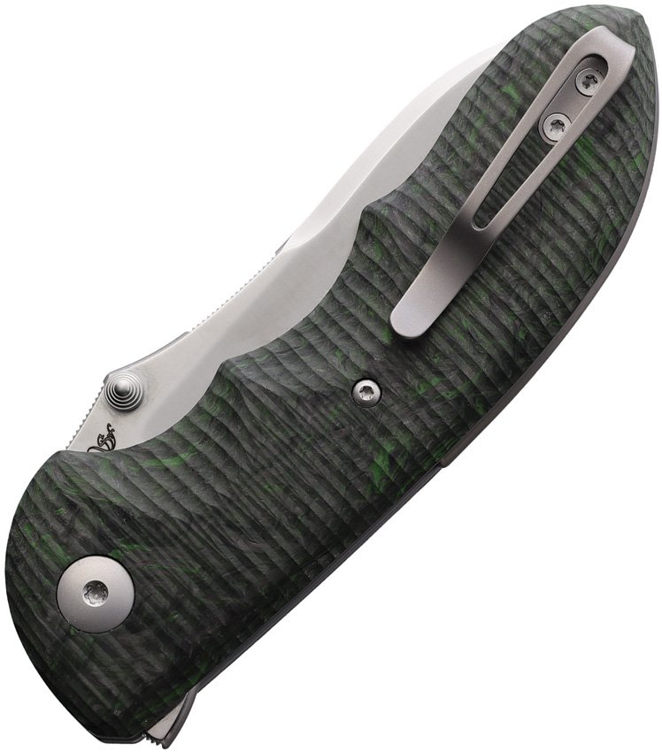 4.5″ (11.43cm) closed. 3.5″ (8.89cm) satin finish MagnaCut steel blade. Green Dark Matter carbon fiber handle. Thumb stud. Extended tang. Pocket clip. Boxed.