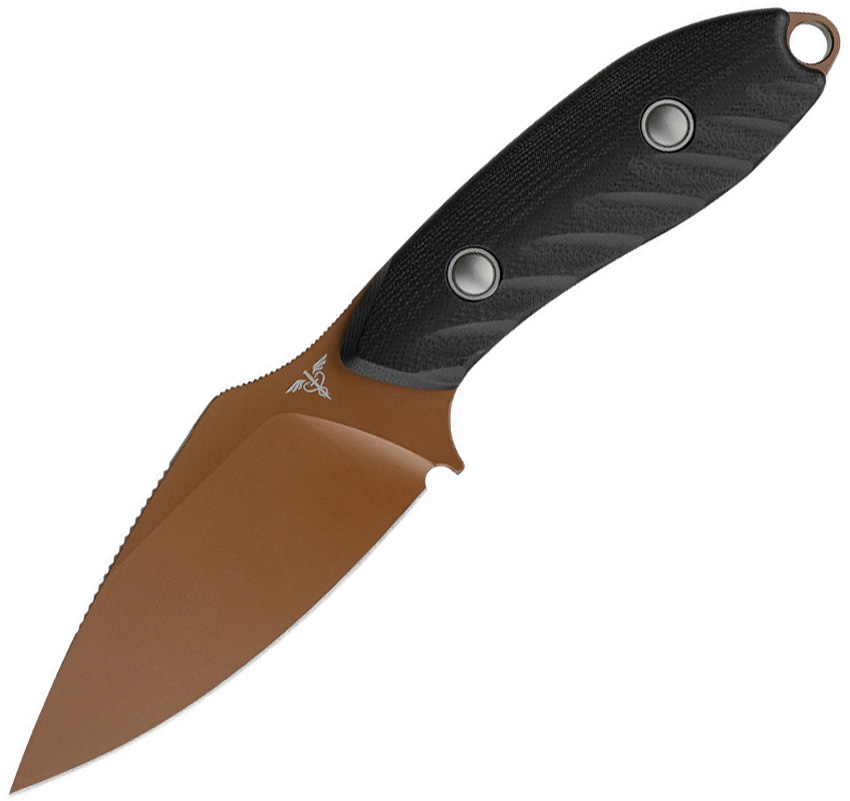 7.38″ (18.75cm) overall. 3.5″ (8.89cm) flat ground 14C28N Sandvik stainless drop point blade. Black G10 handle. Full, extended tang. Lanyard hole. Copper Dune finish blade. S. O. A. R. Clip. Black Kydex belt sheath. Boxed.