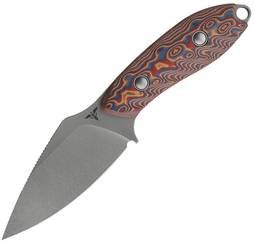 7.38″ (18.75cm) overall. 3.5″ (8.89cm) stonewash finish 14C28N Sandvik stainless drop point blade. Raindrop micarta handle. Full, extended tang. Lanyard hole. S. O. A. R. Clip. Black Kydex belt sheath. Boxed.