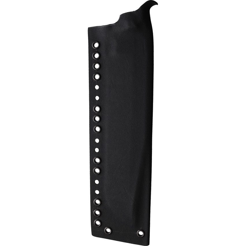 15″ (38.1cm) overall. 9″ (22.86cm) black oxide coated 80CrV2 carbon steel bladewith stone grind. Black sculpted micarta handle. Full tang. Lanyard hole. Black Kydex sheath. Boxed.