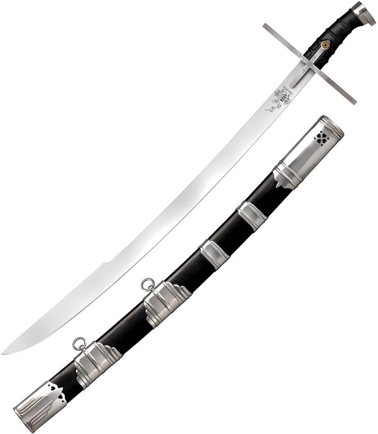 37″ (93.98cm) overall. 31″ (78.74cm) satin finish 1055HC steel blade. Black leather wrapped handle. Steel guard and pommel. Hatchet point blade. Black wood scabbard. Boxed.