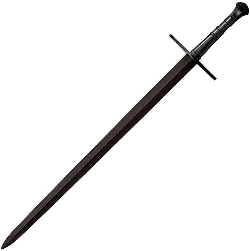 Construction: 1055 Carbon Steel; Overall: 45.5″; Blade: 33.5″ l Carbon Steel l Standard Edge l Black Finish; Handle: Black l Leather; Other Info: Black guard and scent stopper pommel. Black leather scabbard with blued finish fittings. Boxed.
