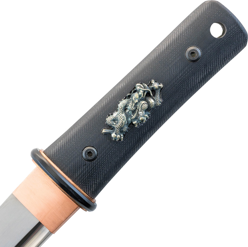 16″ (40.64cm) overall. 10.25″ (26.04cm) blade. Black G10 handle. 1566 steel tanto blade with real hamon line and copper habaki and seppa. The tsuka encapsulates the tang in textured G10 and is dual pinned for a secure grip which is unremovable. Silver dragon menuki embedded in handle. Textured black saya features an olive paracord sageo around a polymer kurikata and kojiri. Comes in cardboard tube.