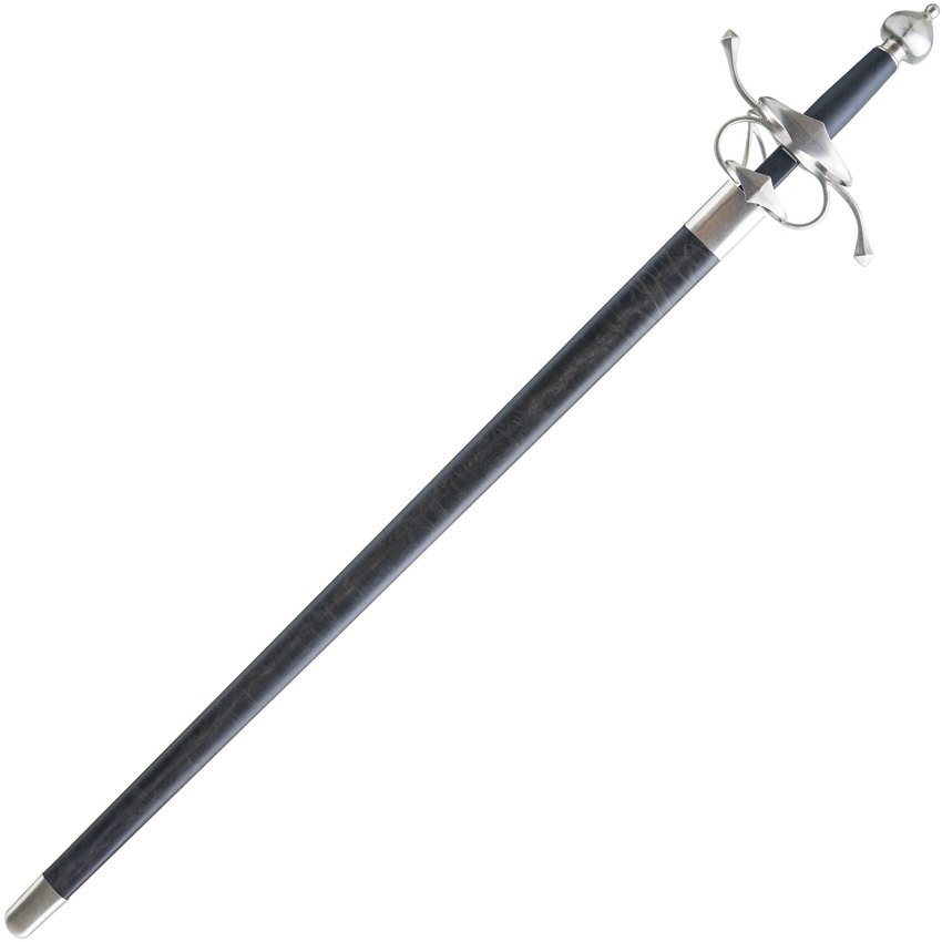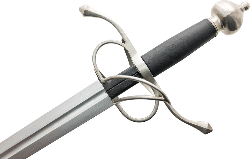 40″ (101.6cm) overall. 33″ (83.82cm) satin finish 5160 carbon steel blade. Black leather wrapped handle. Steel guard and pommel. Weight: 2.5lb. Based on an original German side sword. Black wood scabbard. Boxed.